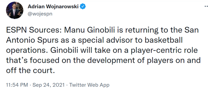 来源:24直播网09-25 10:0224直播网9月25日讯,圣安东尼奥马刺官方宣布,马努-吉诺比利将加入马刺管理层,担任篮球运营部的特别顾问。44岁的妖刀,终于正式回归马刺大家庭。ESPN报道称,吉诺比利的工作将以球员为中心,关注马刺年轻球员场内场外的成长。