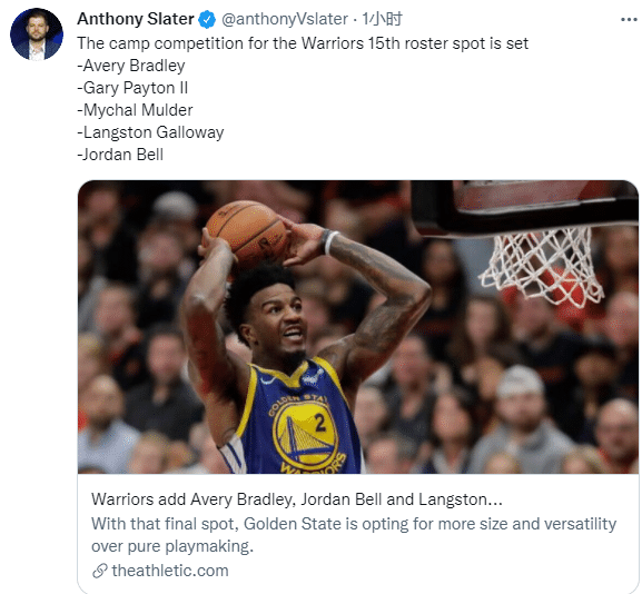 勇士官宣签约布拉德利!训练营20人名单正式确定,多人争夺最后一席