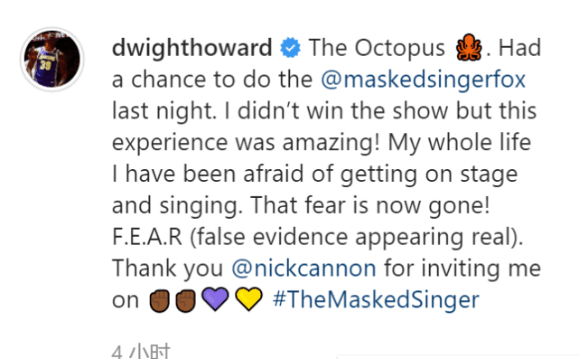 霍华德本人也在社媒上连续更新这次比赛的动态,晒出自己登台的视频后,也配文写道:“章鱼。昨晚,我有机会参加‘蒙面歌手’大赛。我没有赢下这场比赛,但这次经历实在太棒了!我这辈子一直很怕登台唱歌,现在这种恐惧消失了!谢谢你们邀请我!”