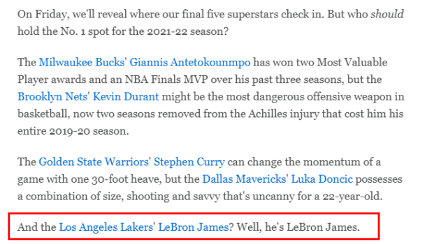 谈及字母哥,过去三年,他已经夺得两座常规赛MVP奖杯和一座总决赛MVP;谈及杜兰特,他是现役最可怕的进攻武器,已经彻底从大伤中回到巅峰状态;谈及库里,他可以用30英尺外的远投改变比赛的走势;谈及东契奇,他的球技全面且只有22岁;谈及詹姆斯,ESPN的简评最逗:好吧,那可是勒布朗-詹姆斯!