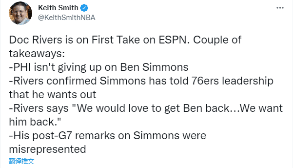里弗斯还表示东部半决赛抢七赛后对西蒙斯的言论被很多人曲解了,当时里弗斯表示:我不确定西蒙斯能否成为总冠军球队的首发控卫;老里如此言论也是西蒙斯申请离队的一大原因。