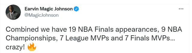 值得一提的是魔术师在几天前还转发了自己和詹姆斯的合影,并配文写道:“合计19次总决赛经历,9个总冠军,7个MVP,7个总决赛MVP……太疯狂了。”魔术师生涯9进总决赛,5夺总冠军,3次拿到MVP,3次拿到总决赛MVP,詹姆斯生涯至今10进总决赛,4夺总冠军,4次拿到MVP,4次拿到总决赛MVP。
