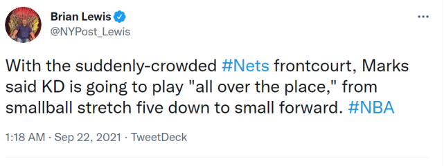 连续签下阿德和米尔萨普后,篮网的前场变得有些拥挤。谈到杜兰特时,马克斯表示,杜兰特新赛季将打多个位置,他可以出任小球阵容的中锋,拉开进攻空间,也可以打大前锋和小前锋。换言之,杜兰特可以视球队需求,游走于三号位至五号位之间。