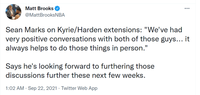 杜兰特已经在8月初以4年1.98亿美元提前续约篮网,接下来的悬念就是哈登和欧文的续约了。篮网总经理马克斯带来了两人续约的最新进展。“他俩看上去很棒,精神状态也很好,已经准备好开始新赛季了。提前续约的问题上,我已经和他们有过了积极的对话,接下来两周,我会亲自和他们继续讨论。”马克斯此前就表示,自己很有信心把三巨头继续留在布鲁克林。