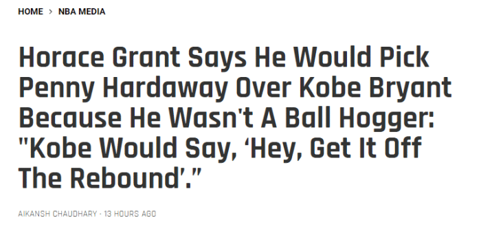值得一提,格兰特的讲解之所以扎心湖蜜,因为科比也不是一个完美的球员,从格兰特选择便士哈达威做搭档,而不是曾经一起成功夺冠的科比,原因就是科比的打球风格,除了大加索尔这样好脾气、好性格的球员愿意辅佐科比,换成是其他球星,比如魔兽霍华德......跑得比贼都快。