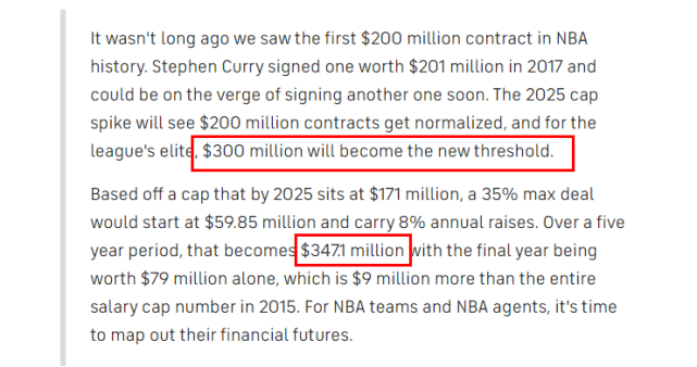 2025年的工资帽,预计能上升到1.71亿美元,那么占工资帽35%的顶薪的起始年薪将来到5985万美元,并保持每年8%的上涨幅度。如果是一份为期5年的合同,总金额能达到3.471亿美元, 最后一年的薪水将是7900万。7900万是什么概念?比2015年整支球队的工资帽还要高900万!