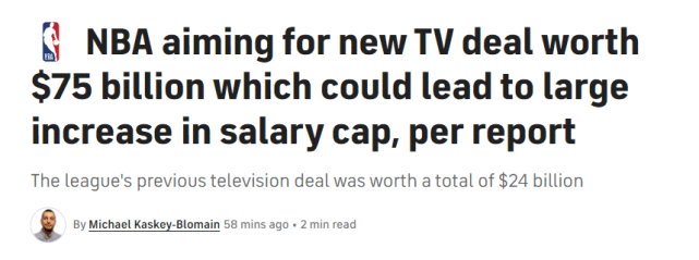和目前的转播合同相比,这将是一次暴涨。现行的合同始于2016-17赛季,总价值240亿美元。电视转播收入的巨幅提升,显然会对联盟的工资帽产生巨大的影响,球员的总薪水也会明显上涨。