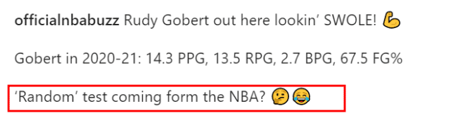 刚进联盟时,戈贝尔曾是一个看上去很瘦的中锋,力量和体重明显不足。但经过几个赛季的刻苦训练,戈贝尔越来越壮,这也提升了他在球场上的表现。休赛期,凡是明显变壮的球员,美媒和球迷都喜欢调侃联盟药检。此前,福克斯在网上晒健身成果,第二天就收到了联盟抽查药检的通知。前湖人后卫卡鲁索也有过类似的经历。