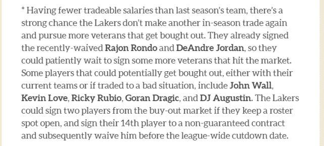 和上赛季相比,湖人今年阵中可用来交易的薪金筹码减少,这意味着他们在赛季中期很有可能不会进行交易, 而是把注意力放在通过买断得到更多老将上。