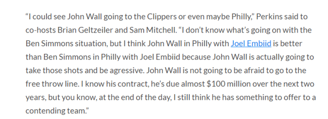 “我认为沃尔可以去快船,甚至是费城,”帕金斯对主持人说道,“我不知道西蒙斯的情况如何了,但我觉得沃尔+恩比德会比西蒙斯+恩比德更好。因为沃尔敢于投那些篮,而且有侵略性,他也不怕站上罚球线。我知道他的合同问题,未来两年得拿快1亿美元,但你知道,最终,我依然认为他可以为一支有望冲冠的球队提供帮助。”