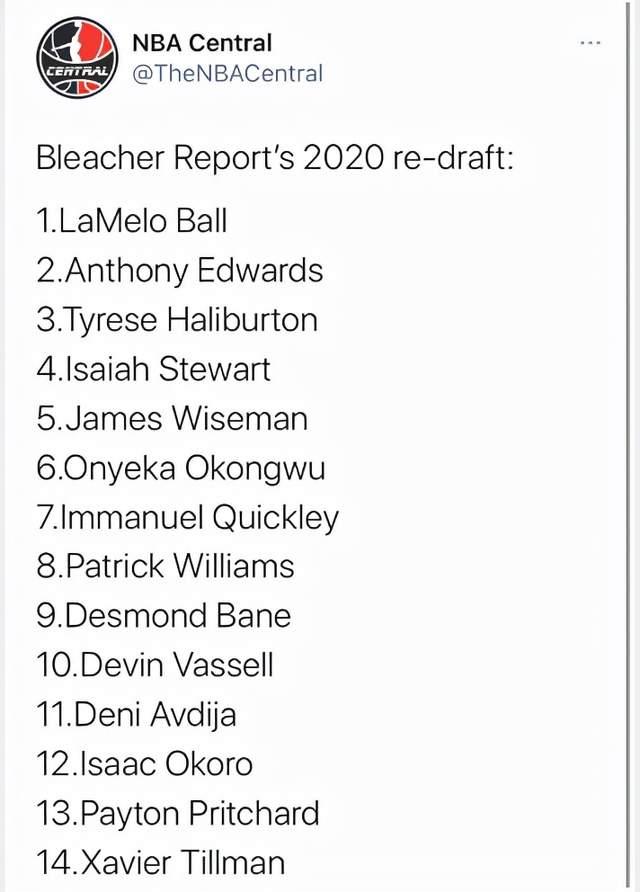 来源:24直播网09-18 16:1324直播网9月18日讯每一年的NBA选秀大会总会引起大家的讨论,因为选秀大会虽然说是很多球探经过长时间选择之后才会给出最终的顺位,可总有很多时候球探也会看走眼,他们也很难判断出球员的真正潜力。所以重排选秀大会就成为了很多媒体都热衷的话题,多年以后反而更加能够看出选秀大会各个球员的真正实力。近日就有一家媒体重新排列了2020年的选秀大会,时隔一年之后,到底哪些球员的表现更好呢?