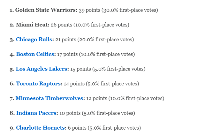 第一个投票话题是哪支球队将迎来最大的反弹?勇士总得分39分位居第一,随后依次是热火、公牛、凯尔特人、湖人、猛龙、森林狼、步行者和黄蜂。显然,随着汤普森的回归,勇士新赛季的战绩有望明显提升。在强势反弹方面,他们最被看好。