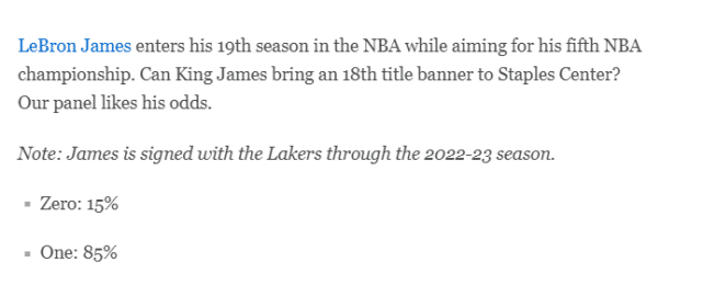 第三个投票话题是詹姆斯在阵中的湖人,还能拿几个冠军?85%的专家给出的答案是一个,15%的专家选择无法再夺冠。对于快要37岁的詹姆斯来说,夺冠的窗口期确实不长了。休赛期,湖人引进不少新援,他们是否有望升起第18面总冠军旗帜呢?