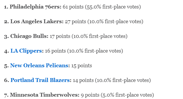 第二个投票话题是哪支球队是混乱之队?这项调查的结果也没有让人感到意外。76人总得分61分位居第一,随后依次是湖人、公牛、快船、鹈鹕、开拓者和森林狼。76人的西蒙斯闹剧会持续性上演,而湖人由于多位全明星同队,也有潜在的磨合隐患,排在第二。