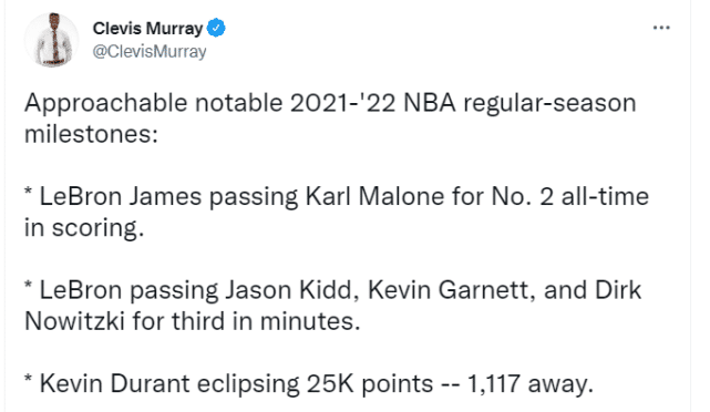 来源:24直播网09-18 10:1524直播网9月18日讯 ,NBA记者Clevis Murray列出了2021-22赛季的10大重要里程碑,詹姆斯独占其中3席,杜兰特、库里等多位球星也将迎来个人生涯的重要时刻——