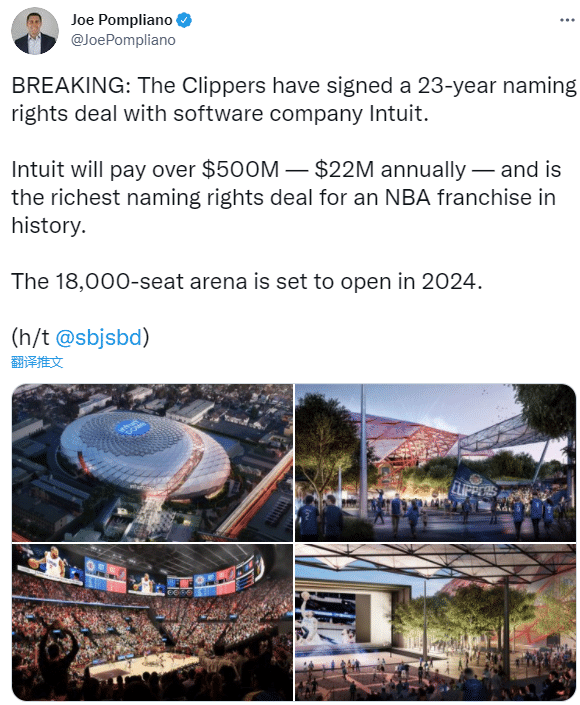 快船的新球馆被命名为IntuitDome,坐落于英格尔伍德,预计将于2024-25赛季被正式启用,快船老板斥资18亿美元打造新球馆,不过在新球馆投入使用之前,快船队已经和Intuit公司达成冠名协议,冠名23年合同金额超5亿美元。