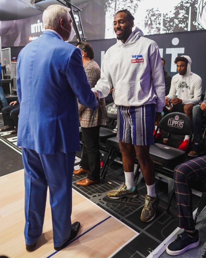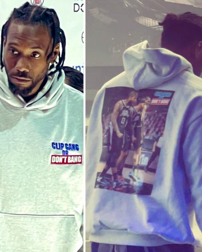 小卡身穿白色连帽衫和短裤出席,帽衫上印着与快船有关的元素,背后印着他和乔治、莫里斯怒吼对手的画面,这是今年快船首轮淘汰独行侠,小卡疯狂隔扣克莱贝尔后快船众将的反应;乔治身穿深色长袖和格子长裤,留着一头精致的地垄沟发型。