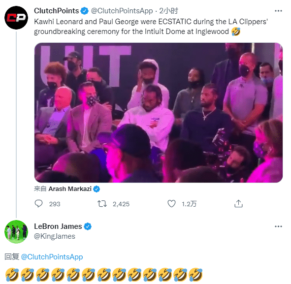 不过,小卡和乔治坐在前排观看现场表演时面无表情,两人都是正襟危坐;美媒《Clutch Points》晒表演视频并调侃:在快船新球馆的奠基仪式现场,科怀-莱昂纳德和保罗-乔治简直是欣喜若狂啊。对此詹姆斯回应13个笑哭的表情。