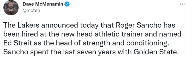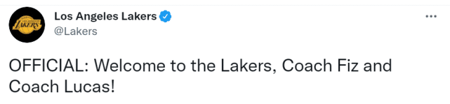 除了菲兹戴尔和卢卡斯三世,湖人还宣布了两项任命。他们聘请罗杰-桑乔作为首席训练师,聘请埃德-斯特莱特为首席体能教练。