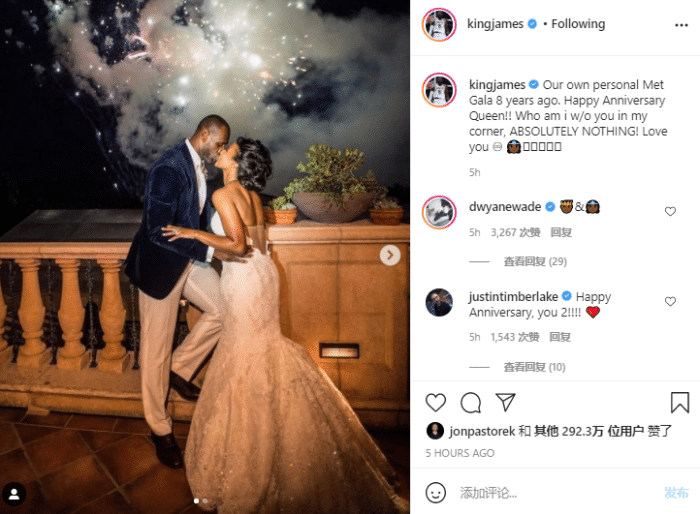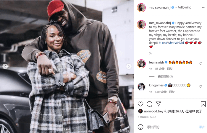 不久前,詹姆斯庆祝他和萨瓦娜结婚8周年纪念日,晒出婚礼照并且深情示爱:结婚纪念日快乐,我的皇后,我的生活不能没有你,爱你!