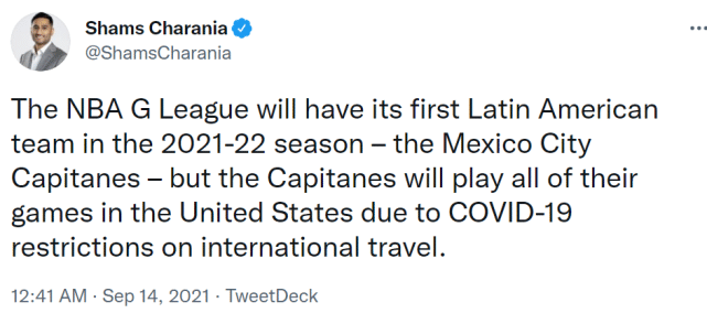 卡皮坦内斯官方也确认了这一消息,他们将成为G联赛的第30支球队,也是美国和加拿大之外的第一支G联赛球队。名记斯坦恩跟进报道称,卡皮坦内斯的主场将会设立在美国的沃斯堡。G联赛引进该球队的目的,是帮助NBA测试未来扩张的可能性。此前NBA联盟也讨论过国际扩军的问题。