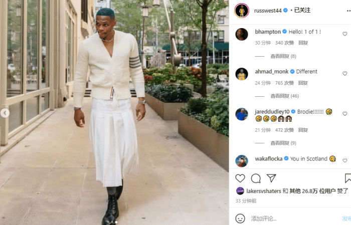 威少白裙子+黑皮靴的潮流照引热议,湖人另一新援蒙克在评论区留言:与众不同;前湖人球员杜德利则留言:Brodie威少绰号!!!!!!!!配上4个笑哭的表情。