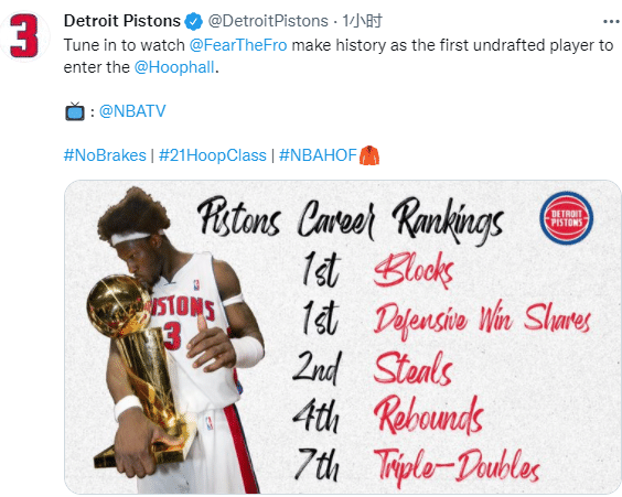 活塞官方恭喜大本入选名人堂创纪录,列出大本的荣誉——队史盖帽第一、队史抢断第二、队史篮板第三和队史三双第七,活塞官推还把头像换成大本传奇的3号。