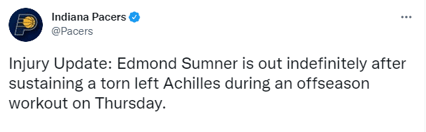 来源:24直播网09-10 09:4924直播网9月10日讯 ,印第安纳步行者队又有坏消息,步行者官宣,由于在训练中遭遇左脚跟腱撕裂的伤病,埃德蒙-萨姆纳将会无限期休战;步行者新星惨遭跟腱撕裂的重伤,遭遇汤神式悲剧,或提前赛季报销。