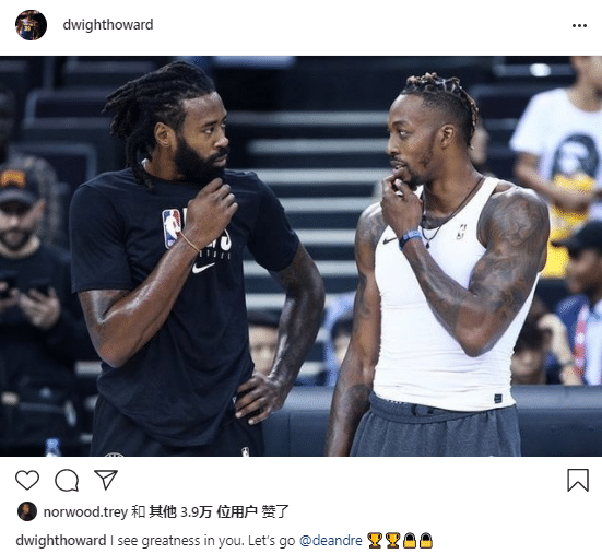 霍华德也欢迎小乔丹加盟湖人,在Ins上晒出两人昔日的赛场照,配文:我看到了你的伟大,让我们一起冲击总冠军吧。