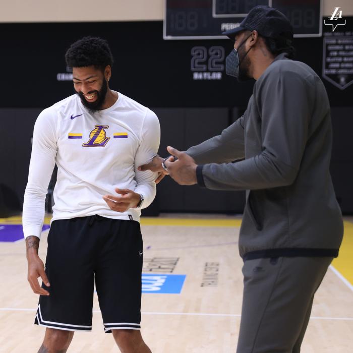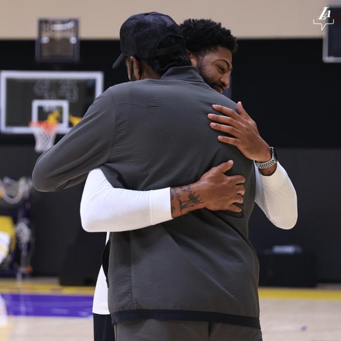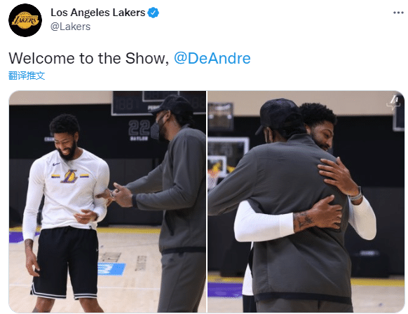 湖人官方晒出小乔丹现身训练馆的画面,小乔丹身穿运动装、戴着口罩和棒球帽,官推写道:欢迎小乔丹来到湖人;浓眉也在现场,他身穿湖人白色训练服,不仅紧紧拥抱小乔丹,还咧嘴大笑难掩开心之情;浓眉终于露脸了,这应该是他在今年休赛期首次公开亮相。