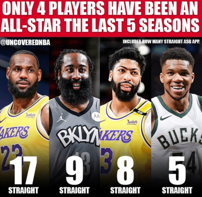 来源:24直播网09-09 11:2024直播网9月09日讯 能够入选NBA全明星阵容的球员,实力自然属于联盟顶级行列。不少NBA运动员,能够入选一次都非常不易。如若可以多次入选,那自然是不小的成就。那么现役球员中,在过去五年都能连续入选NBA全明星的都有谁?美媒近日也是进行一番统计,符合条件的现役球员只有四人,而这其中湖人就占了两人。杜兰特库里两大超巨无缘。