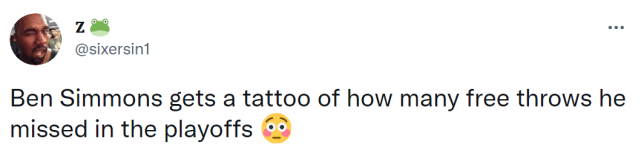西蒙斯在社媒上常常晒出自己的训练照,但这也是球迷吐槽的地方。他并不是不练,而是训练效果令人不满。休赛期的西蒙斯晒出的训练视频中,自己的三分球往往很准,可到了赛季开始时,他连投都不怎么敢投。这次晒出+61的纹身,也有球迷已经开始吐槽:“西蒙斯的纹身是记录自己在季后赛罚丢了多少球。”当然,这只是调侃,数据显示,西蒙斯在上赛季的12场季后赛累计罚丢了48个球。