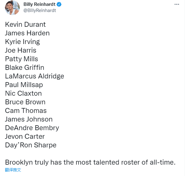 篮网记者Billy Rerinhardt提前晒出篮网15人冲冠阵容——杜兰特、哈登、欧文、乔-哈里斯、米尔斯、格里芬、阿德、米尔萨普、克拉克斯顿、小布朗、27号秀托马斯、詹姆斯、约翰逊、本布里、杰文-卡特和29号秀夏普;直言篮网确实是史上最有天赋的阵容。