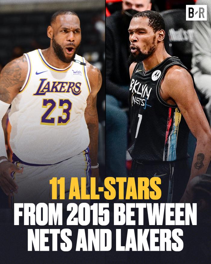 算上阿德的话,篮网新的大名单之中有6名全明星球员——杜兰特(11次)、哈登(9次)、欧文(7次)、格里芬(6次)、米尔萨普(4次)、阿德(7次),总共44次入选全明星;与篮网形成鲜明对比的是洛杉矶湖人,拥有7位全明星球员,59次入选全明星,另外要说的是15年的全明星球员之中,有11人为篮网和湖人效力。