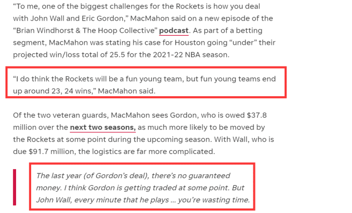 近日,ESPN的名记麦克马洪在节目中也谈到了火箭的遗留问题:对我来说,火箭现在最大的挑战就是如何处理沃尔和戈登。展望新赛季,我觉得火箭将成为一支非常有趣的年轻球队,他们新赛季的胜场不会超过25.5场,可能会以23或者24胜结束。戈登的合同还剩两年3780万,但他合同最后一年是无保障的,我觉得他迟早会被火箭交易。而沃尔的合同还剩2年9170万,这个合同非常棘手很难被交易,而且沃尔接下来上场的每一分钟都在浪费火箭的时间。