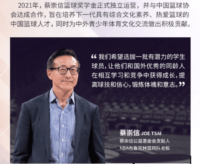 从今年开始,蔡崇信篮球奖学金开始独立运行,而中国篮协就是这一活动的官方支持单位。蔡崇信的篮球奖学金计划每年都会资助十名学生运动员到美国读高中,要求申请人的年龄必须在13-15岁之间,接受过2年以上系统的篮球训练。蔡崇信这么做只愿为中国篮坛培养和输送篮球人才,同时也能够加强中外青少年体育文化的交流。