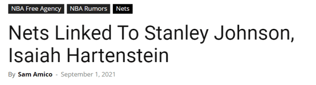 NBA记者Michael Scotto报道称,斯坦利-约翰逊目前正跟随篮网队训练。25岁的约翰逊是2015年的8号秀,上赛季为猛龙出战61场,场均4.4分2.5篮板。如果篮网签下斯坦利-约翰逊,那队内的“约翰逊”可就不少了。