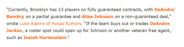 NBA记者Luke Adams解析了篮网目前的阵容情况。“目前,篮网有13名球员是完全保障合同,本布里是部分保障合同,阿利兹-约翰逊是无保障合同。如果球队买断或者交易小乔丹,他们可以为斯坦利-约翰逊或者哈尔滕斯坦恩腾出一个阵容位置。”此前,多位记者已经确认,篮网计划和小乔丹分道扬镳。
