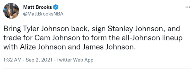 跟队记者Matt Brooks调侃道:“带回泰勒-约翰逊,签下斯坦利-约翰逊,通过交易去得到卡姆-约翰逊(太阳),再加上队内的詹姆斯-约翰逊和阿利兹-约翰逊,我们可以组一个约翰逊阵容了。”