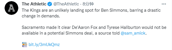 来源:24直播网09-02 10:4124直播网讯 北京时间9月2日,76人和国王关于西蒙斯的交易几乎谈崩,名记SamAmick曝光两队谈判的细节,国王队明确表态,拒绝交易福克斯和哈利伯顿两大新星,该名记还表示:除非76人的要价大幅度下降,否则西蒙斯短期内不会被交易到国王。