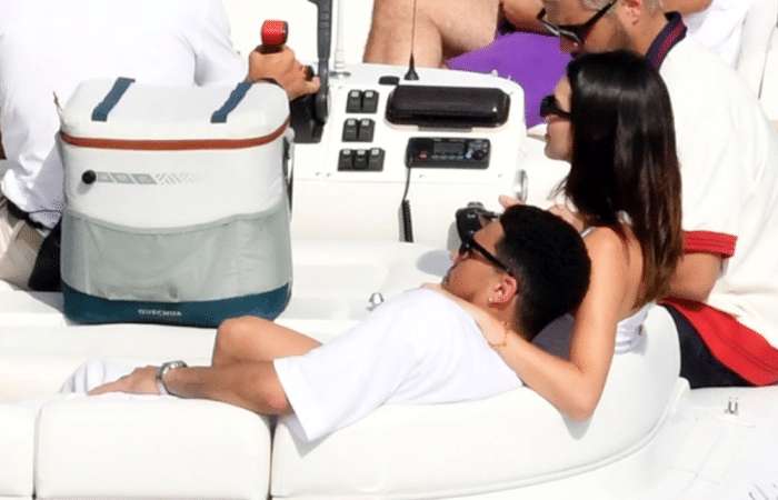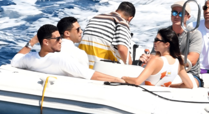饭后布克和詹娜手牵手继续享受海上之旅,太阳球星小心地扶着詹娜的腰从而为后者登上快艇而保驾护航,生怕詹娜出现一丝丝的意外;上船之后,布克和詹娜仍旧手牵手,之后布克直接躺进女友的怀中,这一波狗粮真是撒的太多了。