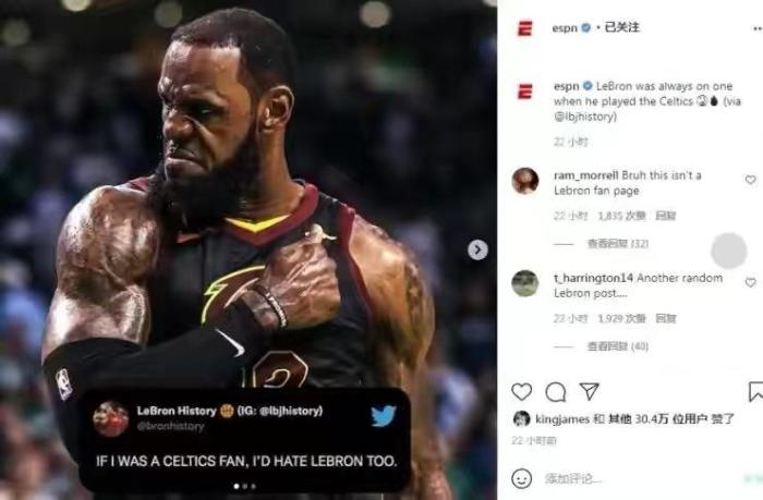 事实上现在的老詹已经不在乎这些争论了,而且偶尔还会拿这样的声音自嘲!其中美国球迷论坛有人说“如果我是凯尔特人球迷,我也会讨厌詹姆斯”老詹本人还点赞了!其实可能这才是真相,像他和杜兰特这样级别的球员,加盟任何球队都会让其他29支球队的球迷讨厌,做好自己就行了,努力打球拿冠军才是王道!