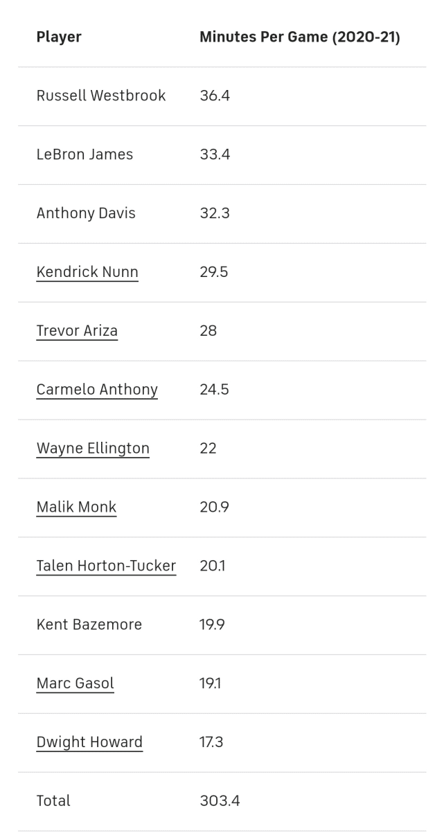 威斯布鲁克36.4分钟、詹姆斯33.4分钟、浓眉32.3分钟、纳恩29.5分钟、阿里扎28分钟、安东尼24.5分钟、埃灵顿22分钟、蒙克20.9分钟、霍顿-塔克20.1分钟、贝兹莫尔19.9分钟、小加索尔19.1分钟、霍华德17.3分钟,他们相加的总和是303.4分钟,比240分钟要多出63.4分钟。这意味着总有人的出场时间要少于上赛季。不少新援愿意拿更少的钱加盟湖人,可能也要面临更少的出场时间,这是为了冲冠不可避免的牺牲。