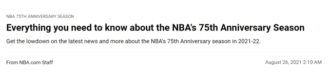2021-22赛季,将是NBA联赛成立75周年,联盟将在新赛季使用75周年纪念LOGO(如下图),并评选史上75大巨星。官方宣布,75大巨星的人选将由媒体、现役和退役球员、教练、总经理和球队管理层共同评选产生。75大巨星不分名次先后,共同组成NBA的75周年纪念阵容。该阵容将在今年10月正式揭晓。