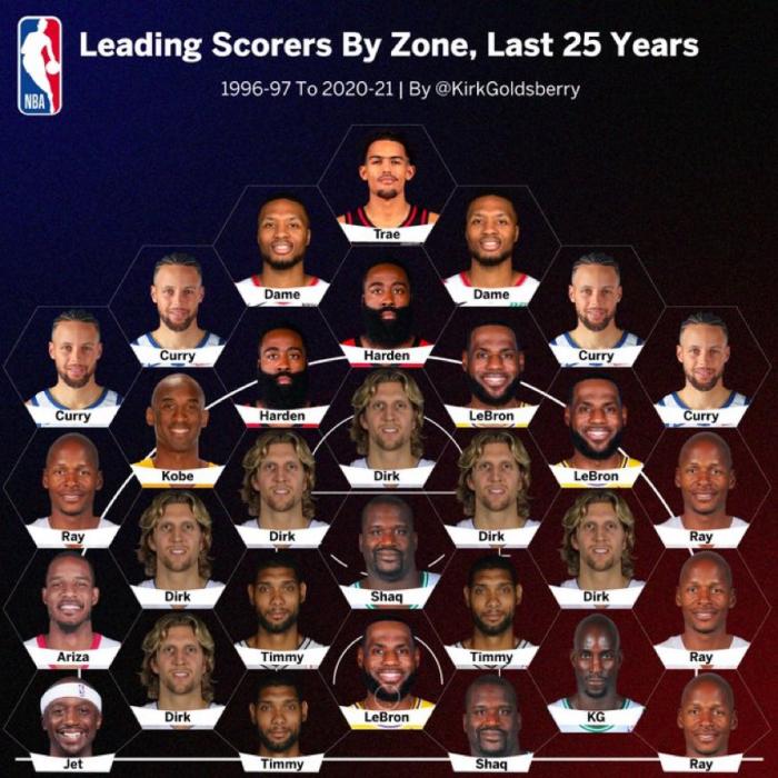 过去25个赛季,篮下小禁区之王是詹姆斯,小禁区外侧围绕篮筐的油漆区被奥尼尔和邓肯包揽,油漆区的沿线则被诺维茨基统治,7个位置独占6席,加内特占据右侧的中距离位置。
