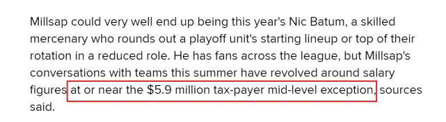 自由球员市场上,有影响力的球员已经不多,米尔萨普算是其中之一。2020-21赛季常规赛,米尔萨普场均贡献9分4.7篮板1.8助攻,季后赛,他场均得到6.4分3.9篮板1.7助攻。Fischer报道称,米尔萨普在全联盟都有粉丝,而消息人士透露,他和多支球队的对话都围绕590万美元的迷你中产进行,换言之,这是米尔萨普的年薪期待数字。
