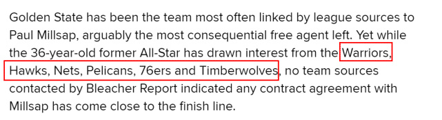 来源:24直播网08-25 10:1524直播网讯 北京时间8月25日,据B/R记者Jake Fischer报道,36岁全明星内线保罗-米尔萨普已经引起多支球队的兴趣。Fischer提到,勇士、老鹰、篮网、鹈鹕、76人和森林狼这六支球队都有兴趣签下米尔萨普,但截至目前,没有一支球队和米尔萨普接近达成签约协议。