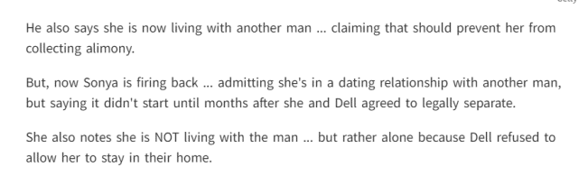 索尼娅再次反击,她承认自己和另一个男人约会,但那是在和戴尔同意合法分居后几个月才开始的。索尼娅表示,自己并没有和这个男人住在一起,而是独自一人居住,因为戴尔不让她住在家里。