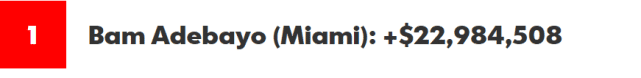 上赛季,阿德巴约的年薪还只有512万美元,但本赛季由于顶薪合同开始生效,他的年薪提升到2810万美元,增加2298万,增幅449.31%。