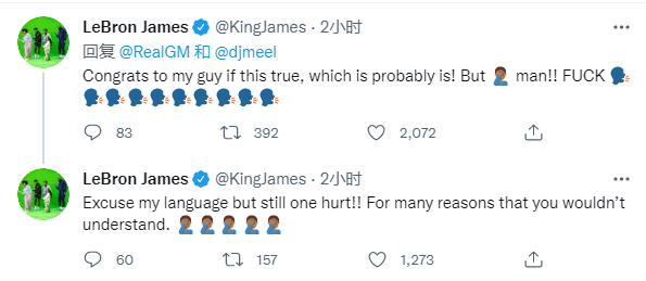 詹姆斯第一时间发推:恭喜我的兄弟!但是FxxK,请原谅我爆粗,他的离队让我感到难受,你们根本无法体会我的心情。